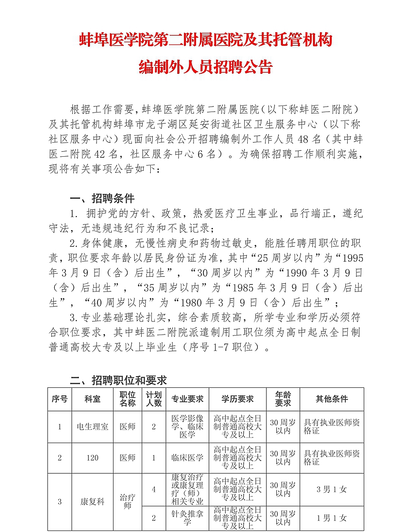 2020年蚌埠醫(yī)學(xué)院第二附屬醫(yī)院及其托管機(jī)構(gòu)編制外人員招聘公告