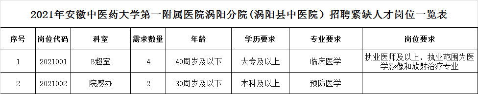 附件:1、2021年安徽中醫(yī)藥大學(xué)第一附屬醫(yī)院渦陽分院(渦陽縣中醫(yī)院)招聘緊缺人才崗位一覽表