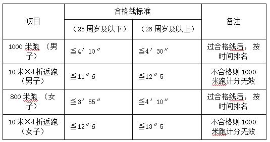 體能測試項(xiàng)目:男子1000米跑、女子800米跑,4×10米往返跑。測試標(biāo)準(zhǔn)參照《公安機(jī)關(guān)錄用人民警察體能測評項(xiàng)目和標(biāo)準(zhǔn)(暫行)》適當(dāng)放寬。