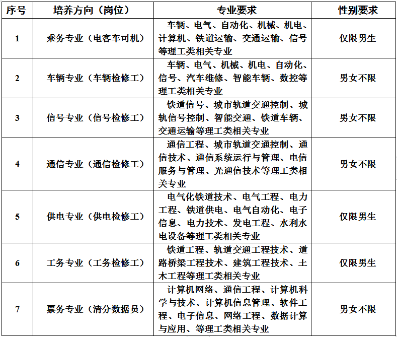 注:軌道交通相關(guān)專業(yè)優(yōu)先、具備相關(guān)技術(shù)崗位工作經(jīng)驗優(yōu)先。每人限報一所院校一個專業(yè),重復(fù)報名視為無效。