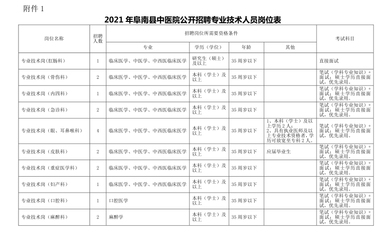 附件1:《2021年阜南縣中醫(yī)院公開(kāi)招聘專業(yè)技術(shù)人員崗位表》