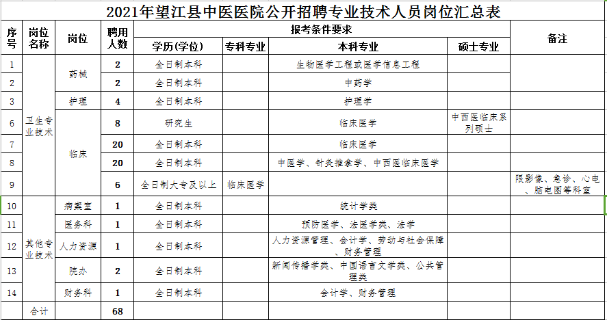 招聘崗位計(jì)劃數(shù)68個(gè),具體招聘專業(yè)、人數(shù)、資格條件等見《2021年望江縣中醫(yī)醫(yī)院公開招聘專業(yè)技術(shù)人員崗位表》(附件1)。