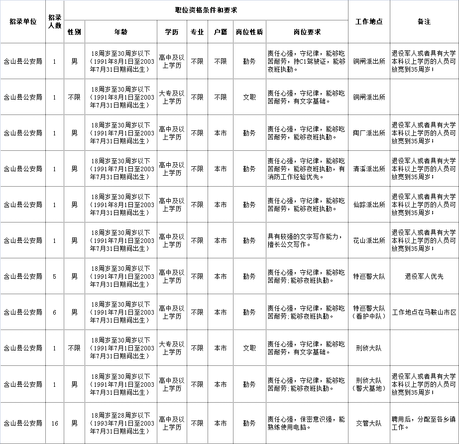 附件1:馬鞍山市公安局含山片區(qū)招聘警務輔助人員職位表