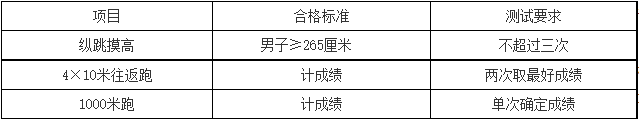 體能測試項(xiàng)目:縱跳摸高、4×10米往返跑、1000米跑。測試標(biāo)準(zhǔn)參照《公安機(jī)關(guān)錄用人民警察體能測評項(xiàng)目和標(biāo)準(zhǔn)》執(zhí)行。