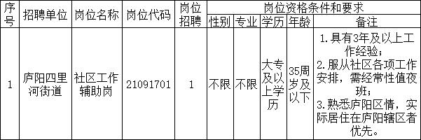 因工作需要,經(jīng)研究同意,委托遠創(chuàng)人力資源管理集團有限公司,公開招聘廬陽區(qū)四里河街道社區(qū)工作輔助崗人員1名?,F(xiàn)就有關(guān)事項公告如下:
