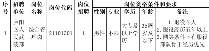 因根據(jù)工作需要,經(jīng)廬陽(yáng)區(qū)人民武裝部研究決定,現(xiàn)委托遠(yuǎn)創(chuàng)人力資源管理集團(tuán)有限公司面向社會(huì)公開(kāi)招考工作人員1名,現(xiàn)將有關(guān)事項(xiàng)公告如下: