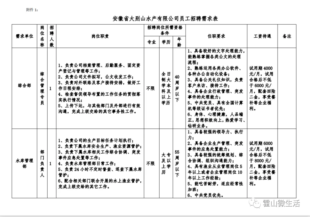 1、安徽省大別山水產(chǎn)有限公司員工招聘需求表