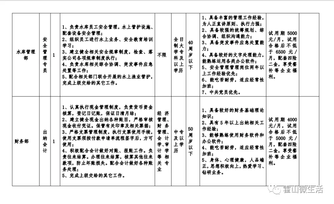 綜合管理部綜合管理專員1名、水庫管理部部門負(fù)責(zé)人1名、水庫管理部安全管理專員1名、財務(wù)部出納會計1名。