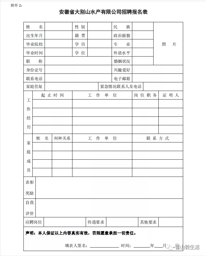2、安徽省大別山水產(chǎn)有限公司招聘報名表
