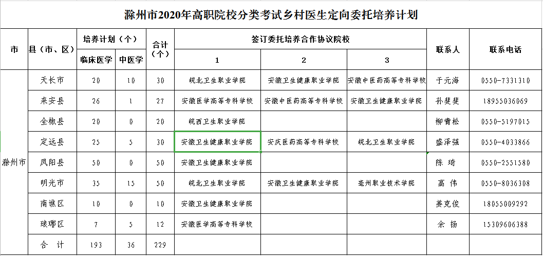2020-05-12 19:28:19閱讀()滁州市衛(wèi)生健康委員會為加強基層醫(yī)療機構鄉(xiāng)村醫(yī)生隊伍建設,創(chuàng)新完善村醫(yī)隊伍培養(yǎng)機制,根據《關于印發(fā)在安徽省高職院校分類考試中實施鄉(xiāng)村醫(yī)生定向委托培養(yǎng)三年行動計劃方案的通知》(皖衛(wèi)科教發(fā)〔2020〕1號)精神,為進一步做好2020年在高職院校分類考試中開展鄉(xiāng)村醫(yī)生定向委托項目,現公布滁州市2020年鄉(xiāng)村醫(yī)生定向委托培養(yǎng)計劃,符合條件有意向的考生請與戶籍所在地衛(wèi)生健康委聯(lián)系,并于2020年5月11日10:00至5月15日16:00登陸網站http://gkbm.ahzsks.cn填報志愿。