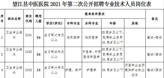 2021-12-14 22:01:56閱讀()望江縣中醫(yī)醫(yī)院為建立滿足發(fā)展需求的專業(yè)技術人才隊伍,根據(jù)《安徽省事業(yè)單位公開招聘人員暫行辦法》(皖人社發(fā)〔2010〕78號)、《關于印發(fā)〈創(chuàng)新編制管理建立公立醫(yī)院編制周轉池制度試點方案〉的通知》(皖編辦〔2017〕59號)、《關于批轉望江縣完善縣級公立醫(yī)院人事薪酬制度實施細則的通知》(望政辦秘〔2017〕23號)等相關規(guī)定,經研究決定,開展望江縣中醫(yī)醫(yī)院2021年第二次公開招聘專業(yè)技術人員工作。具體公告如下: