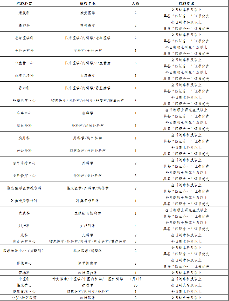 3、除以下崗位外,歡迎各科室中、高級(jí)職稱、各學(xué)科帶頭人洽談合作。