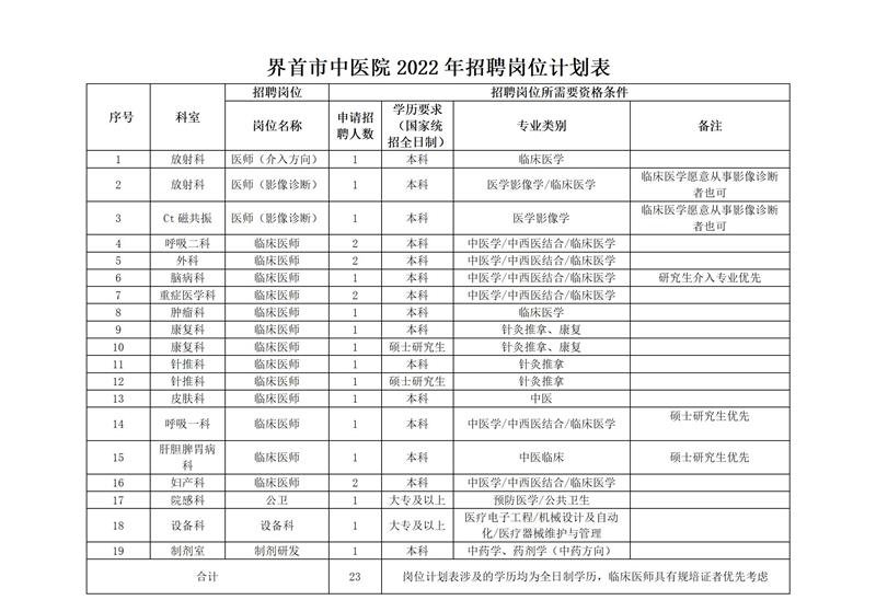 本次計(jì)劃公開(kāi)招聘醫(yī)療衛(wèi)生專(zhuān)業(yè)技術(shù)人員23名,具體招聘崗位、人數(shù)、專(zhuān)業(yè)、報(bào)考條件等詳見(jiàn)《界首市中醫(yī)院2022年招聘崗位計(jì)劃表》(附件)。