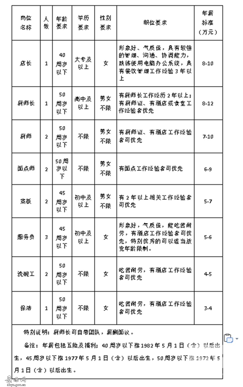 2022-05-07 21:11:52閱讀()岳西網(wǎng)因業(yè)務(wù)發(fā)展需要,岳西縣保安服務(wù)公司承接岳西縣行政服務(wù)中心食堂經(jīng)營(yíng)管理項(xiàng)目,現(xiàn)面向社會(huì)公開招聘食堂工作人員14名,有關(guān)事項(xiàng)公告如下: