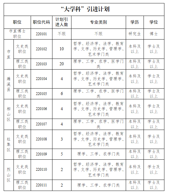 采取“大學(xué)科”+“緊缺專業(yè)”形式,市縣(區(qū))“大學(xué)科”計(jì)劃引進(jìn)博士人數(shù)不限、文史類23名、理工類37名,“緊缺專業(yè)”計(jì)劃引進(jìn)11名(崗位如下):