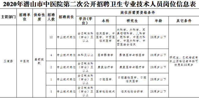 2020年,潛山市中醫(yī)院第二次公開(kāi)招聘衛(wèi)生專業(yè)技術(shù)人員20 名,詳見(jiàn)附件1:《2020年潛山市中醫(yī)院第二次公開(kāi)招聘衛(wèi)生專業(yè)技術(shù)人員崗位信息表》。