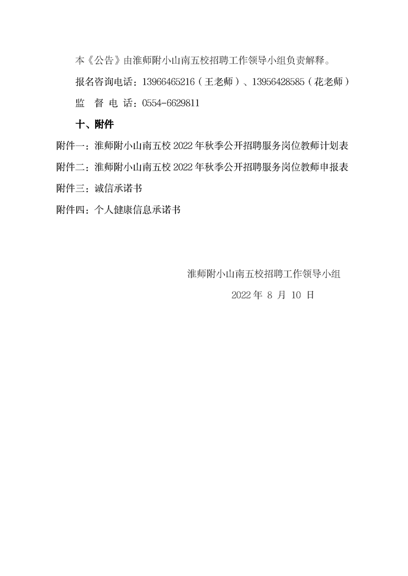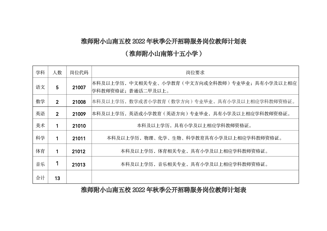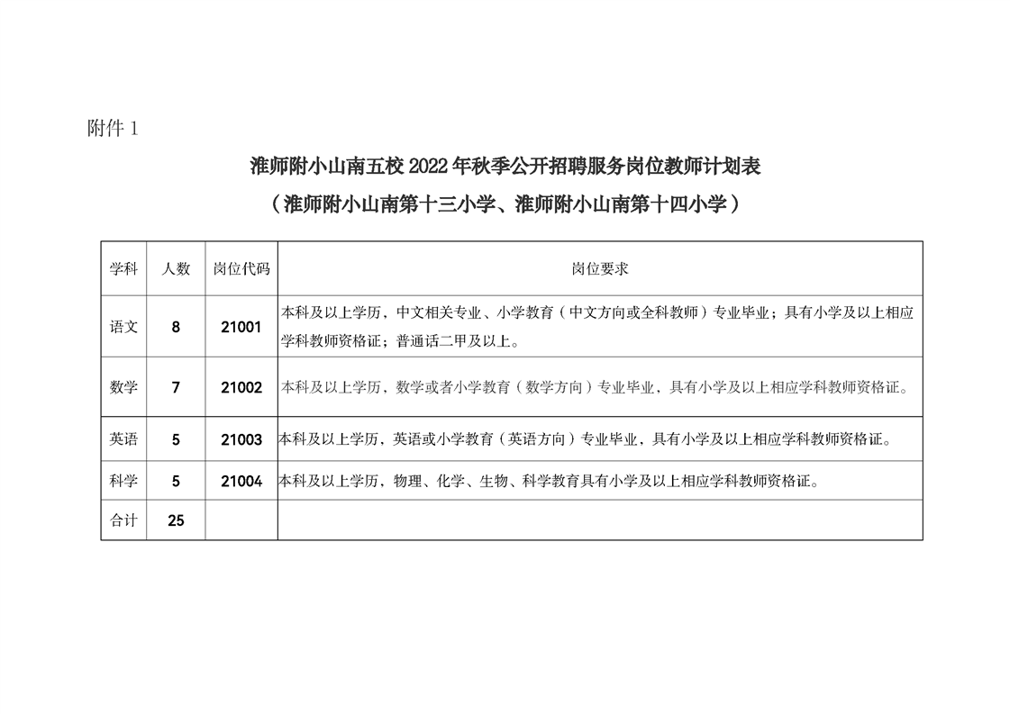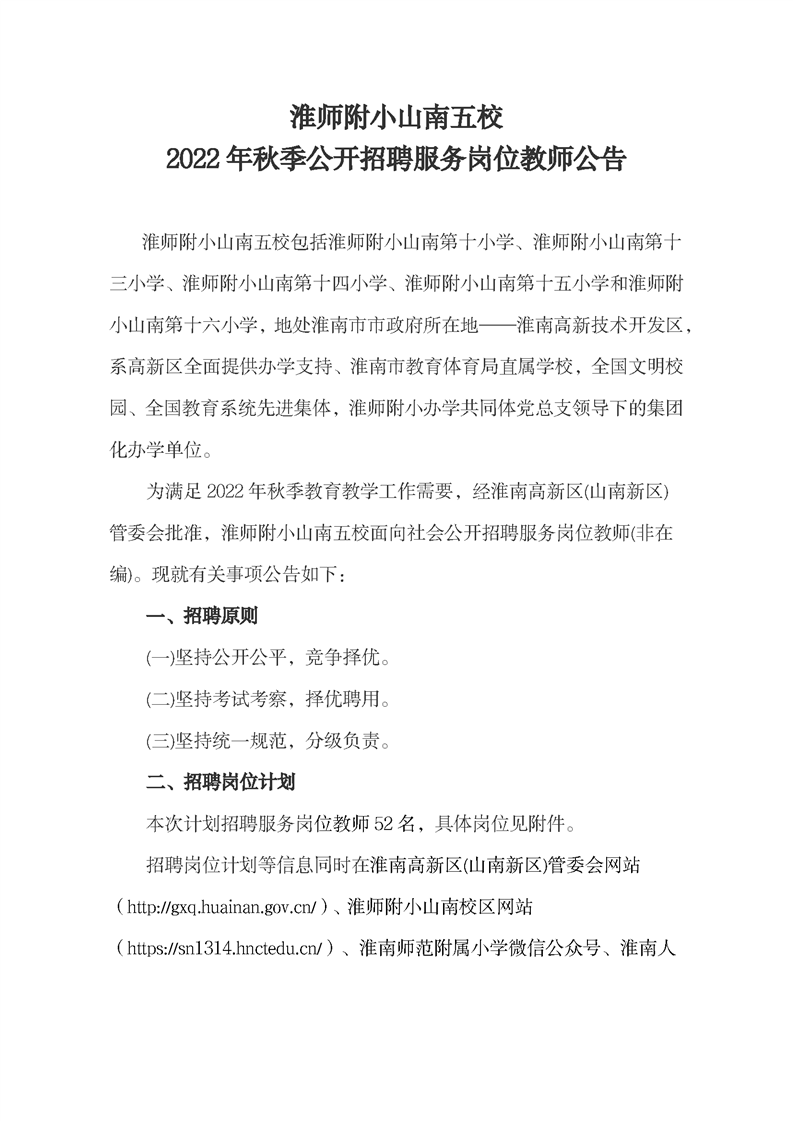 為滿足2022年秋季教育教學(xué)工作需要,經(jīng)淮南高新區(qū)(山南新區(qū))管委會(huì)批準(zhǔn),淮師附小山南五校面向社會(huì)公開招聘服務(wù)崗位教師(非在編)。現(xiàn)就有關(guān)事項(xiàng)公告如下: