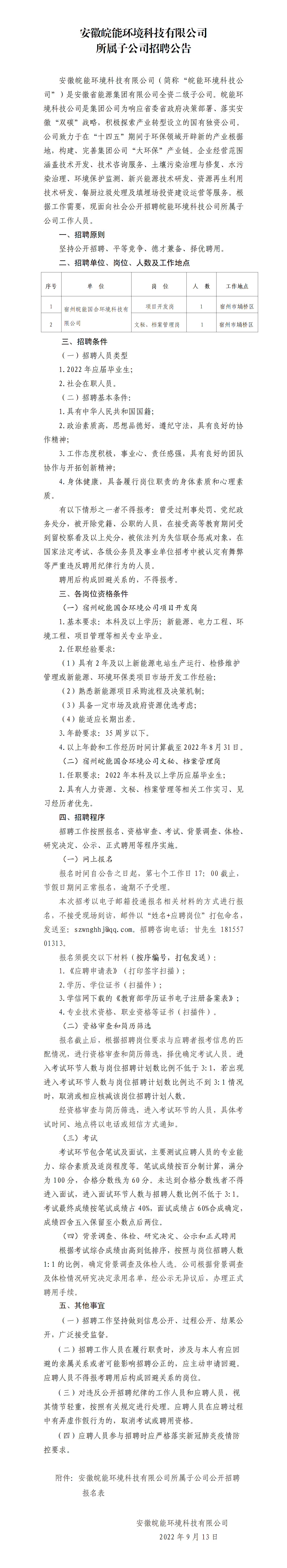2022年宿州安徽皖能環(huán)境科技有限公司所屬子公司招聘公告