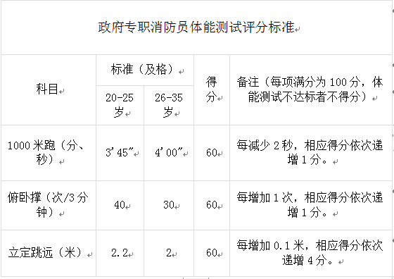 (3)測試項目:政府專職消防隊員1000米跑、俯臥撐、立定跳遠(yuǎn)。
