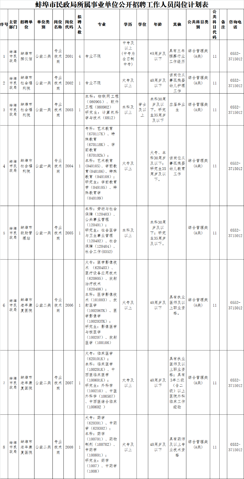 政策咨詢電話:0552-3715012(蚌埠市民政局人事教育科)