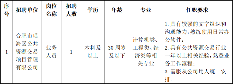 因工作需要,合肥市瑤海區(qū)公共資源交易項(xiàng)目管理有限公司計(jì)劃面向社會(huì)公開(kāi)招聘業(yè)務(wù)人員1名,現(xiàn)就有關(guān)事項(xiàng)公告如下: