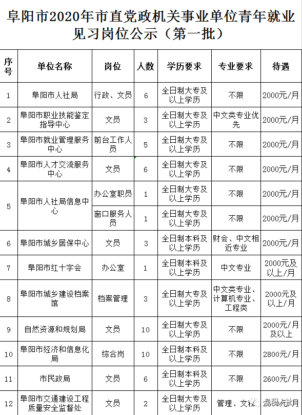 為提高高校畢業(yè)生的就業(yè)能力,根據(jù)安徽省人社廳《關(guān)于印發(fā)安徽省就業(yè)見習(xí)管理辦法的通知》(皖人社發(fā)[2017]54號)和安徽省人社廳等三部門聯(lián)合下發(fā)的《關(guān)于做好2020年機(jī)關(guān)事業(yè)單位就業(yè)見習(xí)工作的通知》(皖人社秘﹝2020﹞98號)精神,阜陽市面向市直黨政機(jī)關(guān)、事業(yè)單位(含公益一類和參公事業(yè)單位)征集就業(yè)見習(xí)崗位,吸納畢業(yè)兩年內(nèi)未就業(yè)的高校畢業(yè)生參加就業(yè)見習(xí)?,F(xiàn)公告如下: