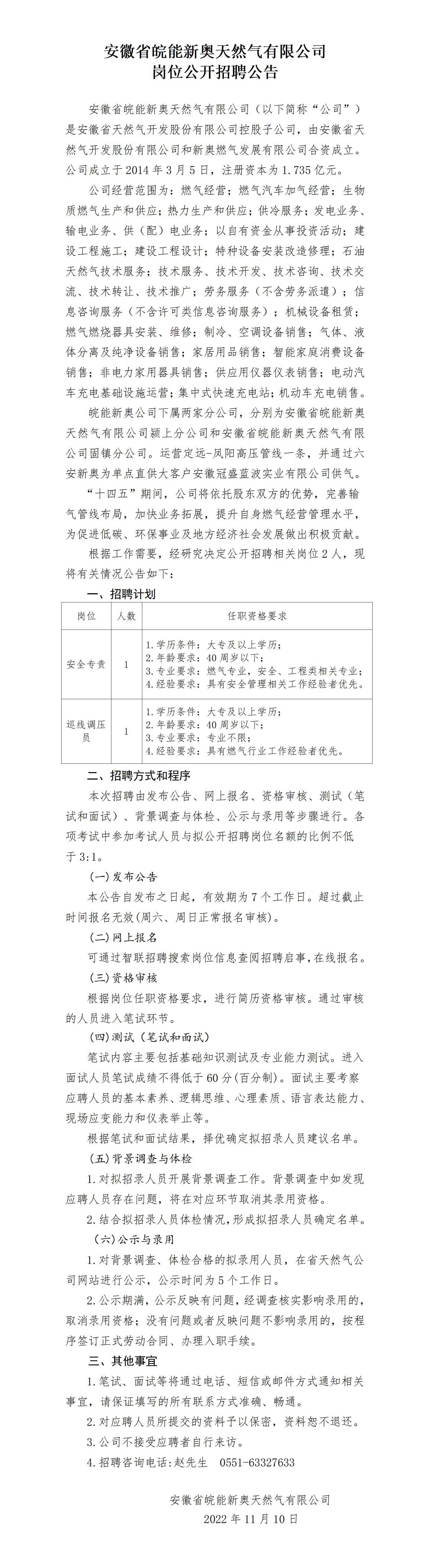 2022年安徽省皖能新奧天然氣有限公司崗位公開招聘公告