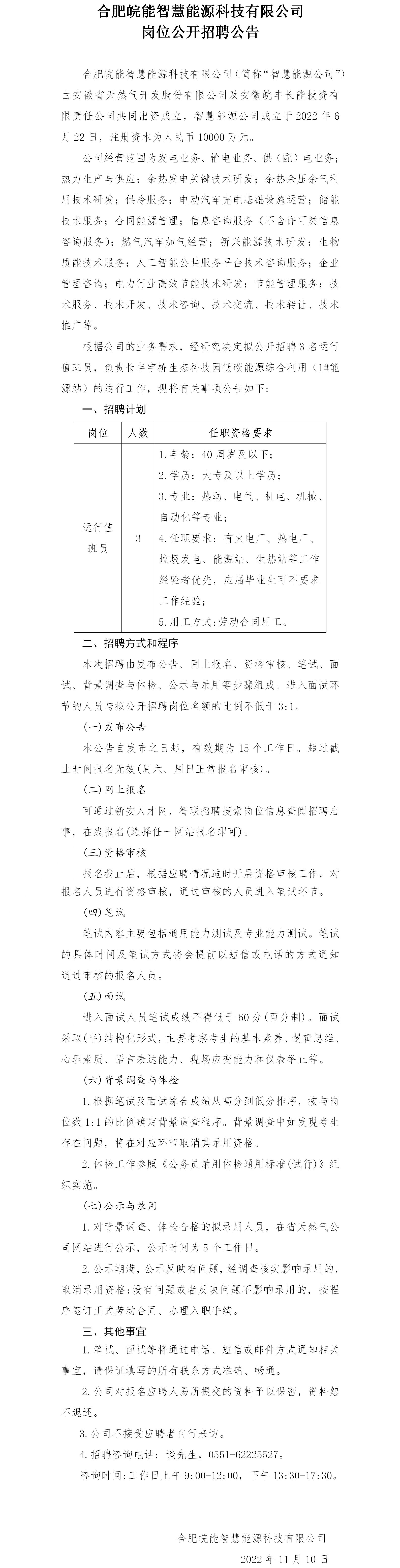 根據(jù)公司的業(yè)務(wù)需求,經(jīng)研究決定擬公開招聘3名運(yùn)行值班員,負(fù)責(zé)長豐宇橋生態(tài)科技園低碳能源綜合利用(1#能源站)的運(yùn)行工作,現(xiàn)將有關(guān)事項(xiàng)公告如下: