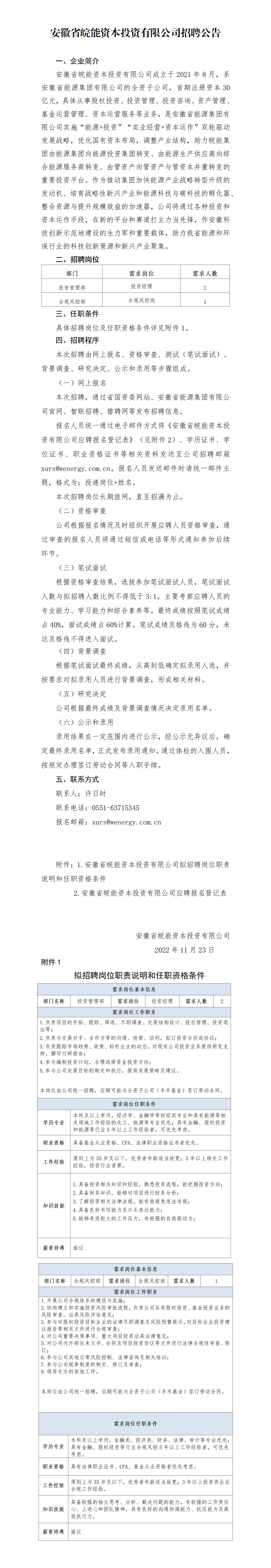 2022年安徽省皖能資本投資有限公司招聘公告