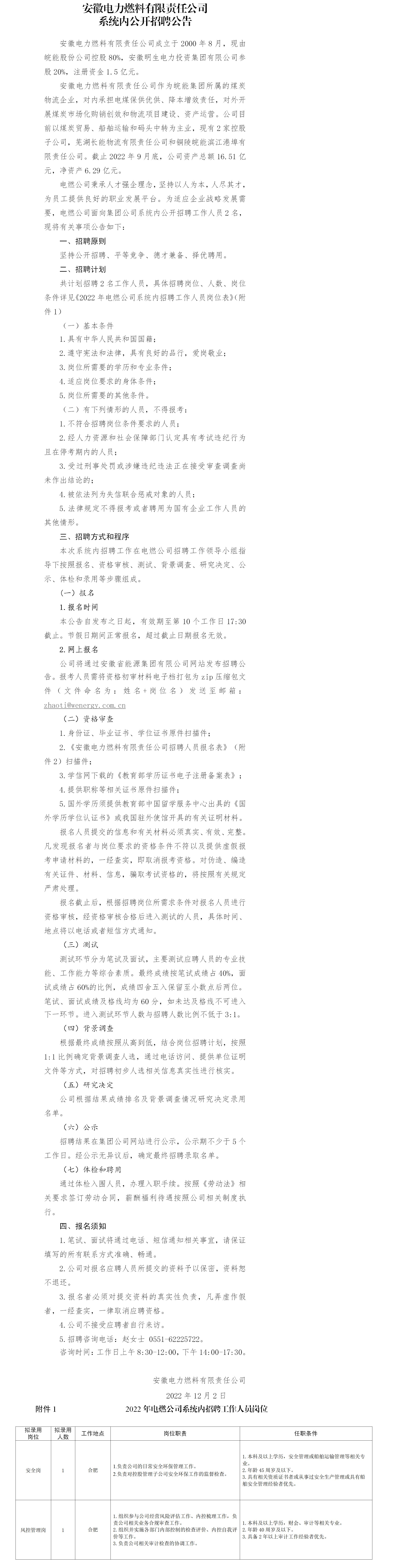 2022年安徽電力燃料有限責(zé)任公司系統(tǒng)內(nèi)公開招聘公告