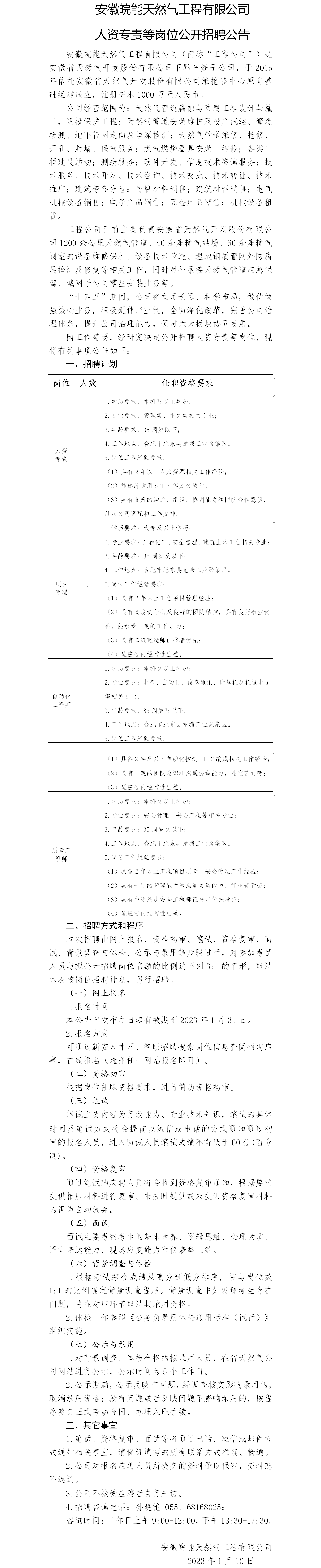 2023年安徽皖能天然氣工程有限公司人資專責等崗位公開招聘公告
