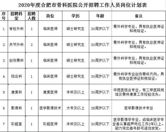 合肥市骨科醫(yī)院公開招聘10位工作人員,具體崗位及條件見《2020年度合肥市骨科醫(yī)院公開招聘工作人員崗位計劃表》(附件)