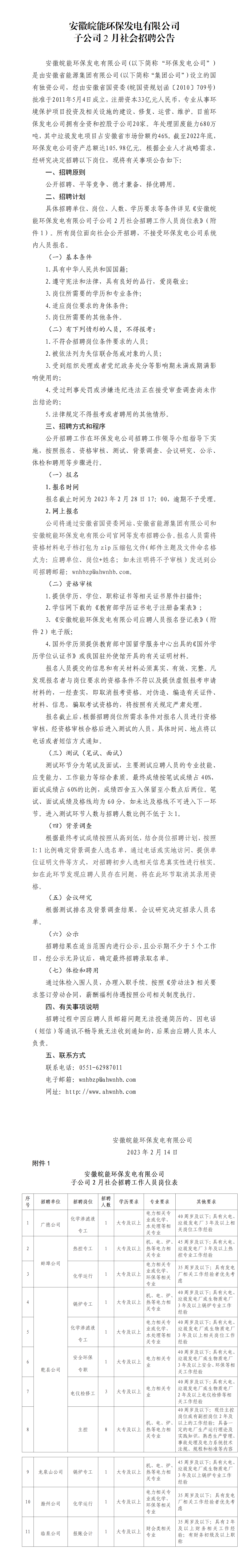 具體招聘單位、崗位、人數(shù)、學(xué)歷要求等條件詳見《安徽皖能環(huán)保發(fā)電有限公司子公司2月社會招聘工作人員崗位表》(附件1)。所有崗位面向社會公開招聘,不接受環(huán)保發(fā)電公司系統(tǒng)內(nèi)人員報名。