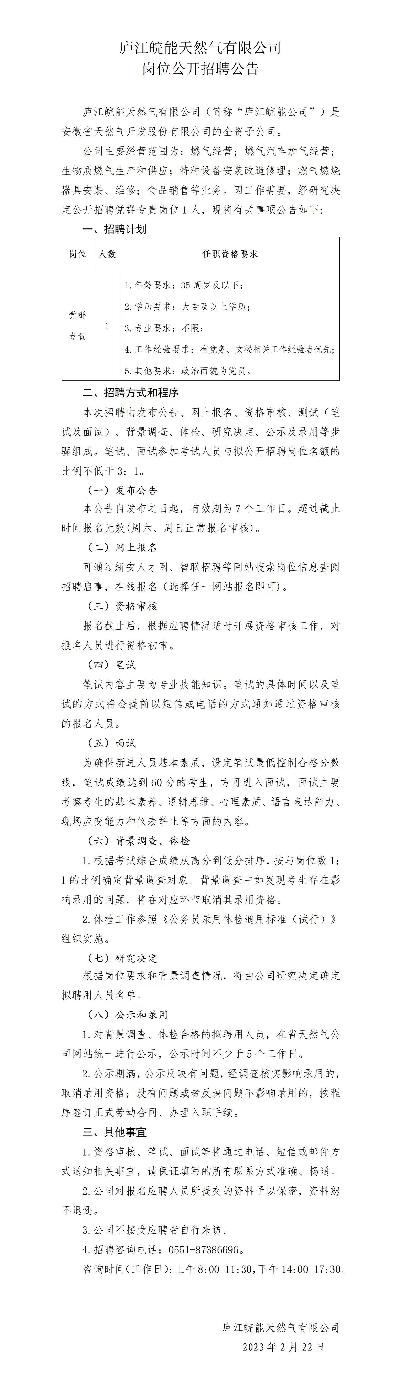 2023年合肥廬江皖能天然氣有限公司崗位公開招聘公告