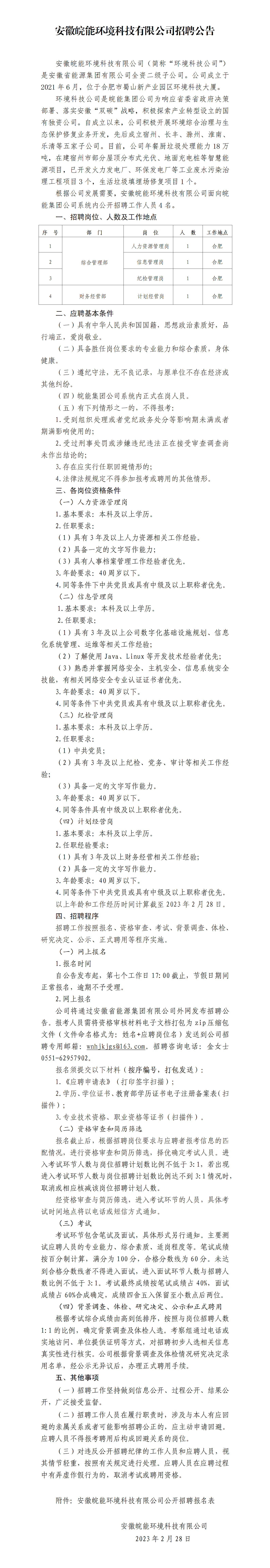 根據(jù)公司發(fā)展需要,安徽皖能環(huán)境科技有限公司面向皖能集團(tuán)公司系統(tǒng)內(nèi)公開招聘工作人員4名。