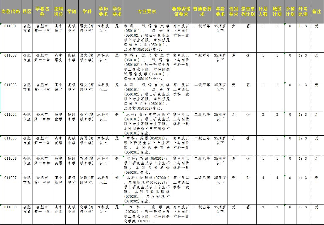 根據(jù)合肥市教育局、合肥市人力資源和社會(huì)保障局聯(lián)合發(fā)布的《2023年度合肥市直屬學(xué)校新任教師公開(kāi)招聘公告》,合肥十中此次共招聘語(yǔ)文(3人)、英語(yǔ)(2人)、數(shù)學(xué)(3人)、物理(4人)、化學(xué)(3人)教師15名,具體崗位要求如下: