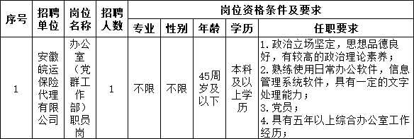 安徽皖運(yùn)保險(xiǎn)代理有限公司,成立于2012年,位于安徽省合肥市,是一家以從事保險(xiǎn)業(yè)為主的企業(yè)。為適應(yīng)發(fā)展需要,更廣泛地選拔優(yōu)秀人才,經(jīng)研究決定,委托遠(yuǎn)創(chuàng)人力資源管理集團(tuán)有限公司公開(kāi)招聘1名工作人員?,F(xiàn)將有關(guān)事宜公告如下: