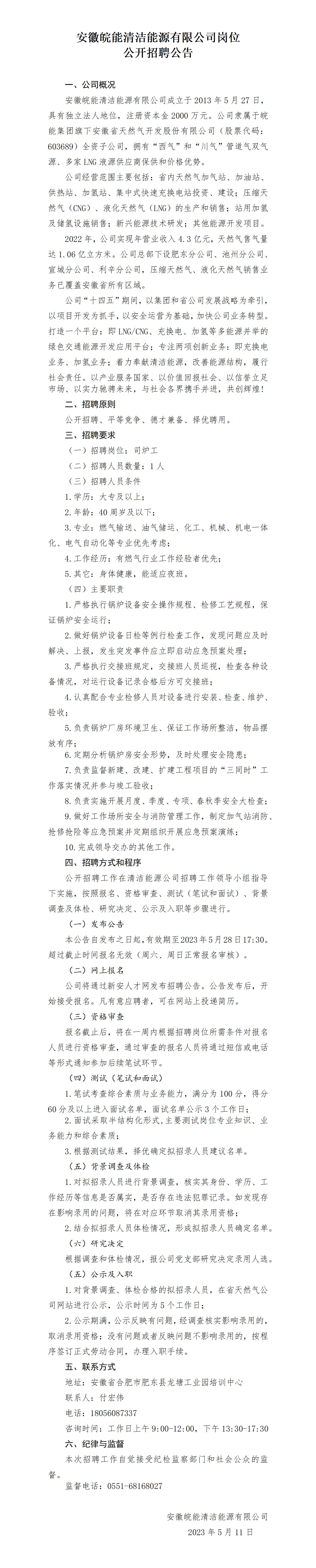 2023年安徽皖能清潔能源有限公司崗位公開招聘公告