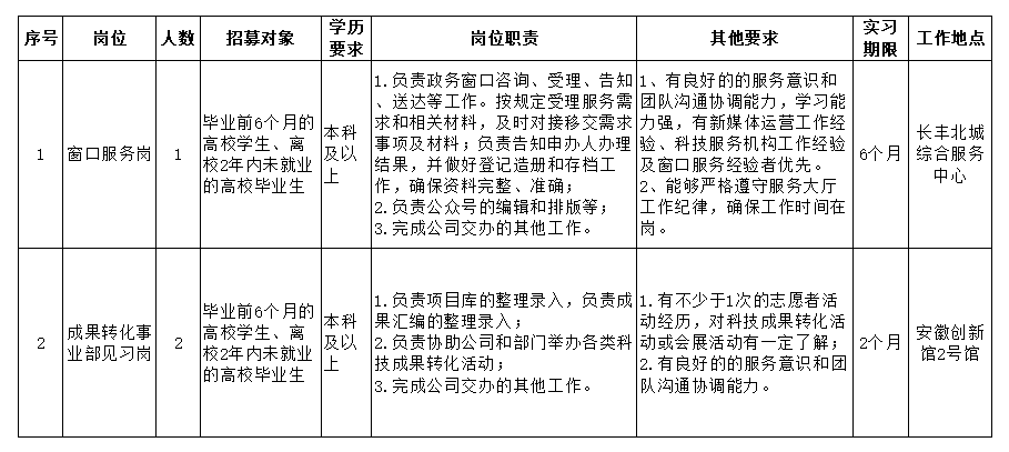 安徽科技大市場建設(shè)運營有限責(zé)任公司成立于2020年9月,是國有全資有限責(zé)任公司,公司以推動構(gòu)建專業(yè)化、市場化、國際化的科技成果轉(zhuǎn)化市場服務(wù)體系為目標(biāo),依托安徽創(chuàng)新館,建強用好安徽科技大市場,打造合肥濱湖科學(xué)城高質(zhì)量發(fā)展新引擎?,F(xiàn)因工作需要,面向社會招募3名見習(xí)人員,有關(guān)事項公告如下: