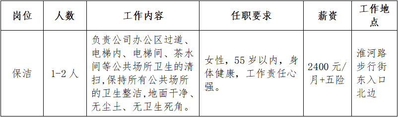 招聘單位四:合肥某國有企業(yè)(物業(yè)公司)招聘保潔人員