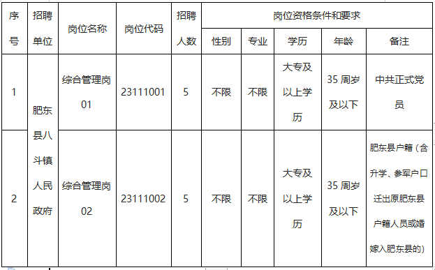 (6)綜合管理崗02崗位需提供肥東縣戶籍或婚嫁入肥東縣戶籍,其中因升學(xué)、參軍戶口遷出的,需由所在社區(qū)或派出所提供相應(yīng)戶籍證明材料。