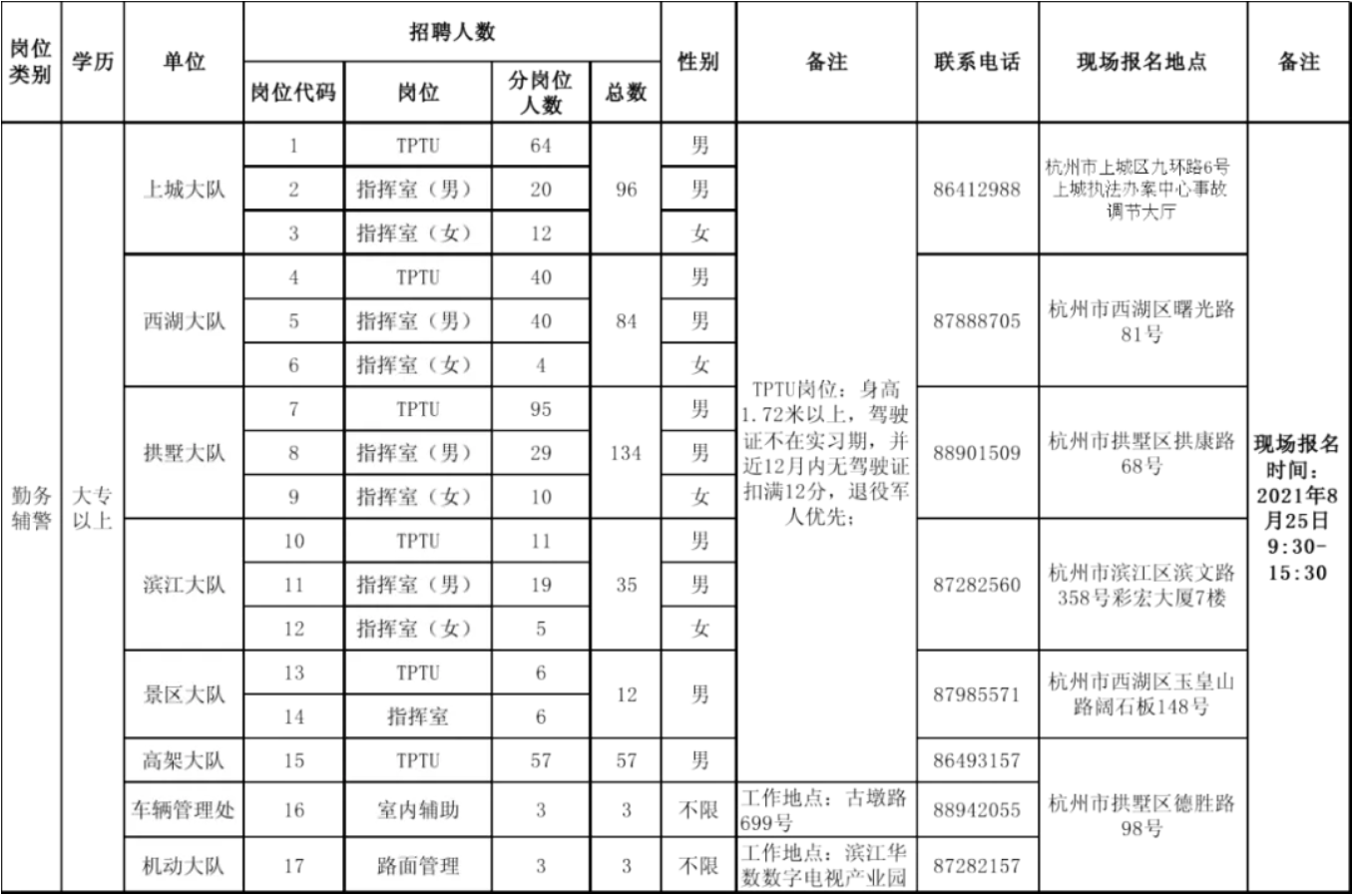 本次共計劃招聘警務輔助人員(交通管理輔警)423名,從事杭州市公安局交警支隊交通輔助和路面巡邏工作。