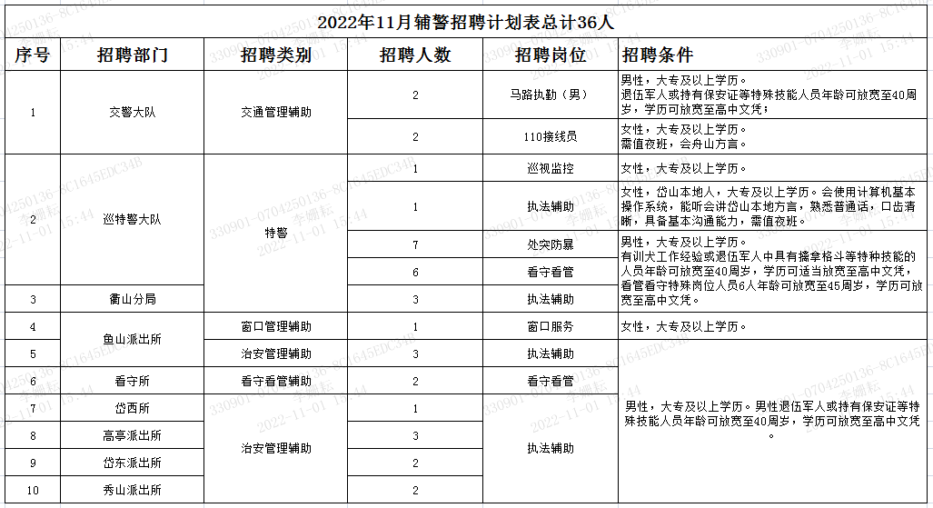 2022-11-13 19:45:07閱讀()岱山縣人民政府因工作需要,岱山縣公安局面向社會公開招聘警務輔助人員,有意者可以按以下規(guī)定條件和程序報名。