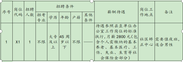 (一)本次招聘1名輔助人員由勞務(wù)公司與之簽訂勞動(dòng)合同并以勞務(wù)派遣形式派遣至縣司法局從事司法行政輔助工作。崗位如下: