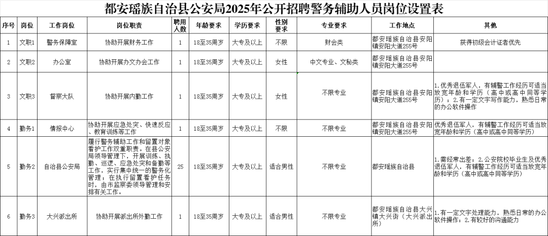 都安瑤族自治縣公安局本次擬招聘警務輔助人員30人,具體招聘崗位、人數、資格條件詳見《都安瑤族自治縣公安局2025年公開招聘警務輔助人員崗位設置表》
