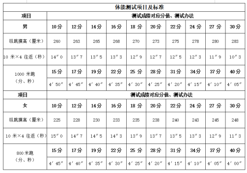 3. 體能測(cè)試: 按照縱跳摸高、10米×4折返跑、男子1000米跑、女子800米跑順序進(jìn)行,滿(mǎn)分100分。詳情如下: