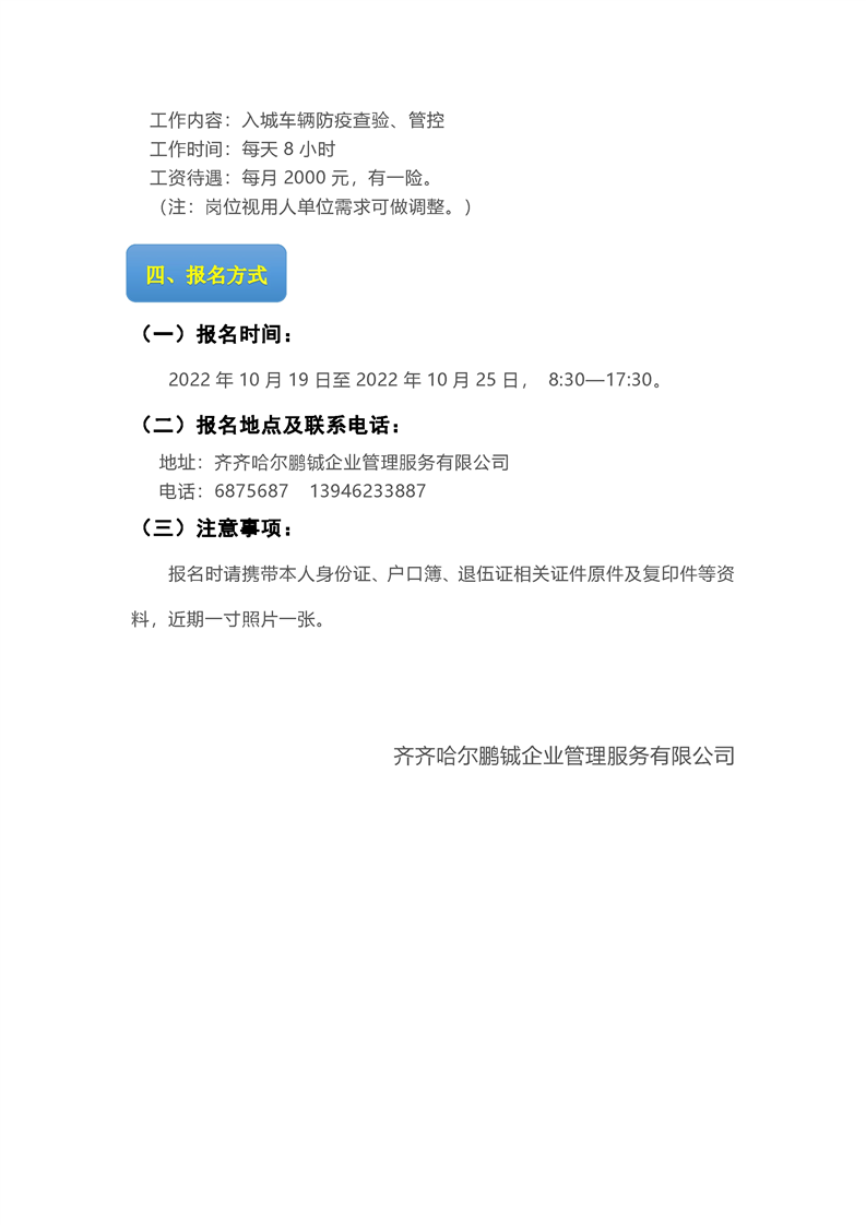 2022-10-21 22:56:46閱讀()齊齊哈爾市建華區(qū)人民政府為做好高速公路卡口疫情防控工作,有效管理和維護(hù)道路交通秩序,決定公開(kāi)招聘交通協(xié)管員,現(xiàn)將有關(guān)事項(xiàng)公告如下: