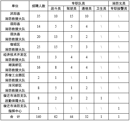2023-10-26 22:55:54閱讀()宿遷人才網(wǎng)因工作需要,宿遷市消防救援支隊(duì)計(jì)劃面向社會公開招聘140名專職消防員(編外),具體招聘事宜公告如下: