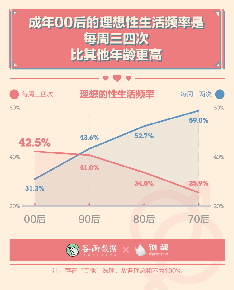 年輕的身體里裝著更加旺盛的性需求。超四成的成年00后理想性生活頻率是每周三四次,理想性愛(ài)時(shí)長(zhǎng)在30分鐘以上,這兩個(gè)比例都比其他年齡更高。