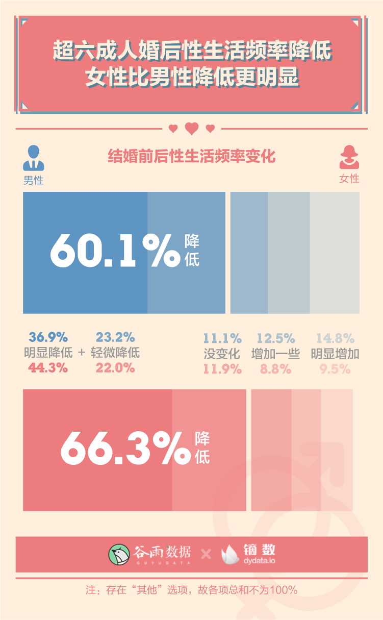 多數(shù)情況下,結(jié)婚會(huì)讓性生活更少,尤其對(duì)女性而言。60.1%的男性、66.3%的女性在結(jié)婚之后性生活頻率降低。